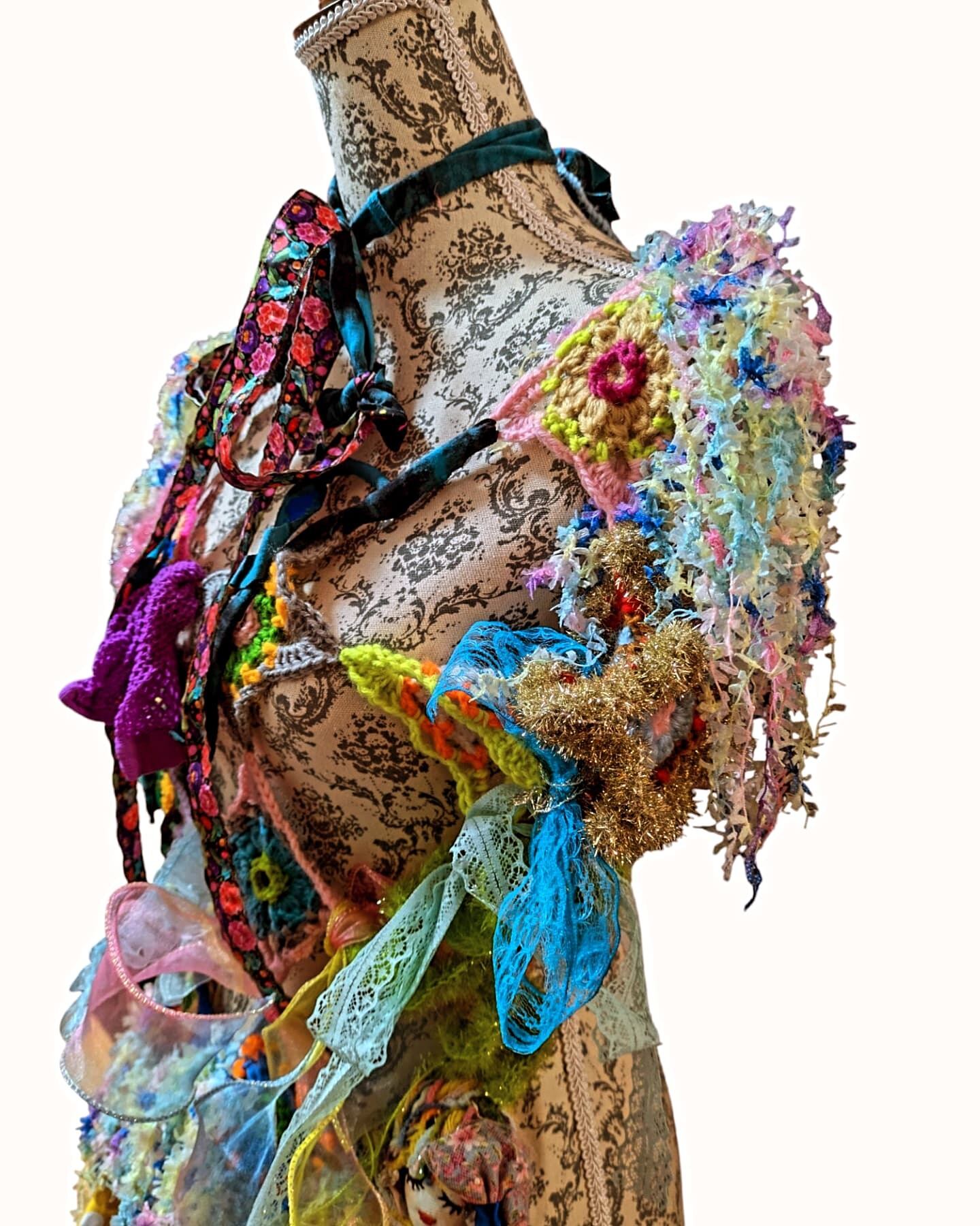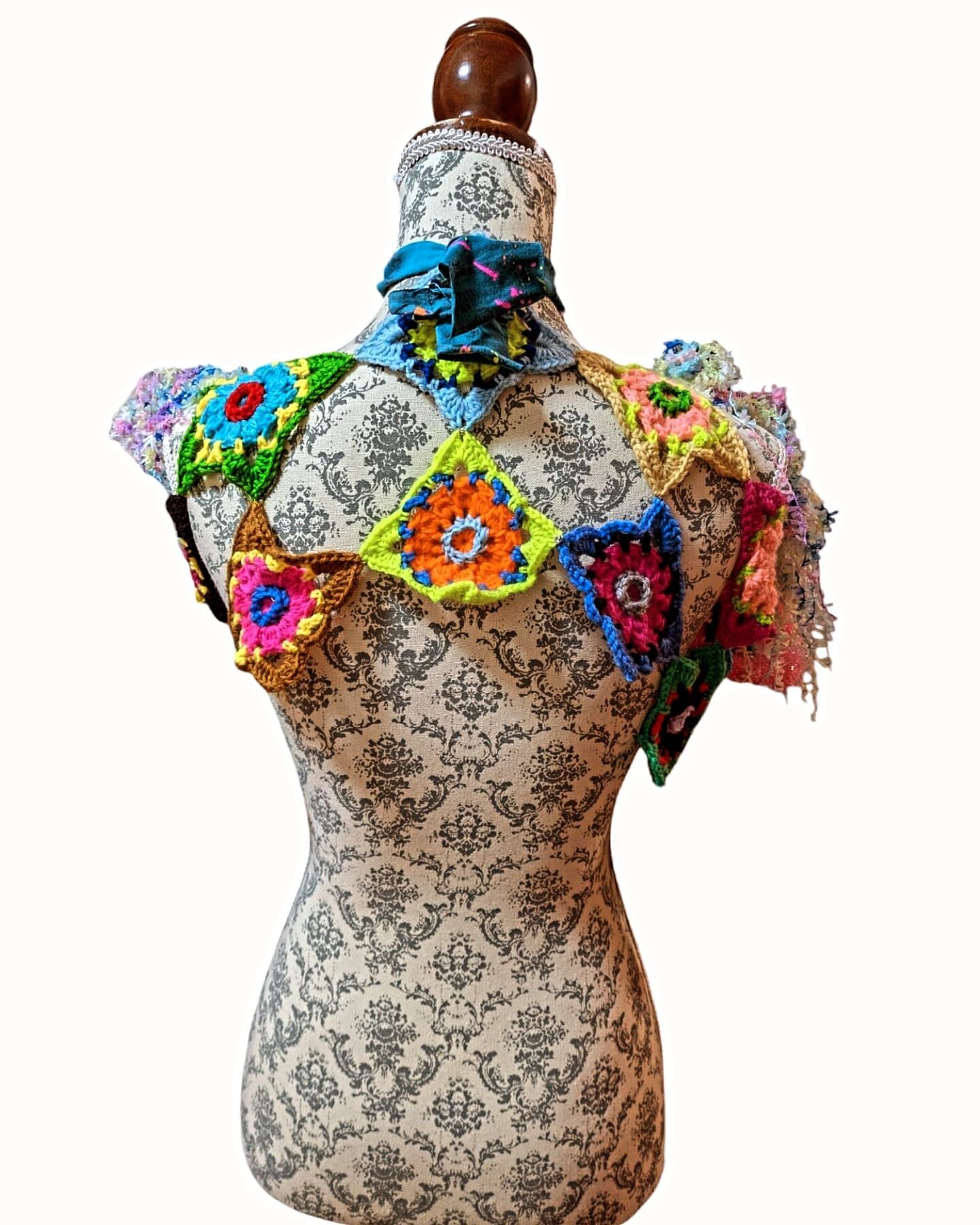 お花のカラフルグラニースクエアのモチーフをひし形につなぎ合わせ、ベストなのか?キャミなのか?作りまさした❤(ӦvӦ。)