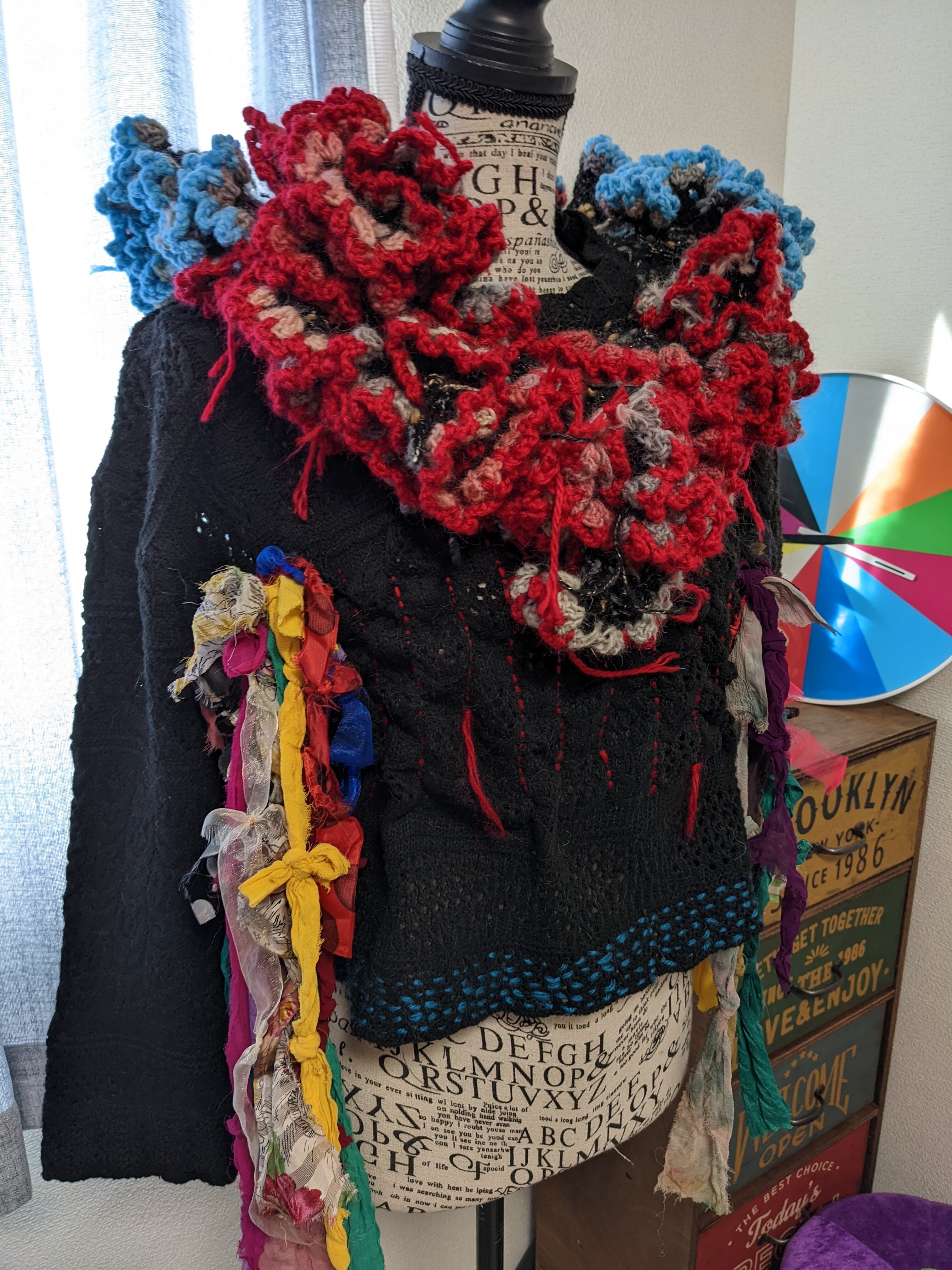 襟元の毛糸のフリルをかなりだめなんですか加工しました。