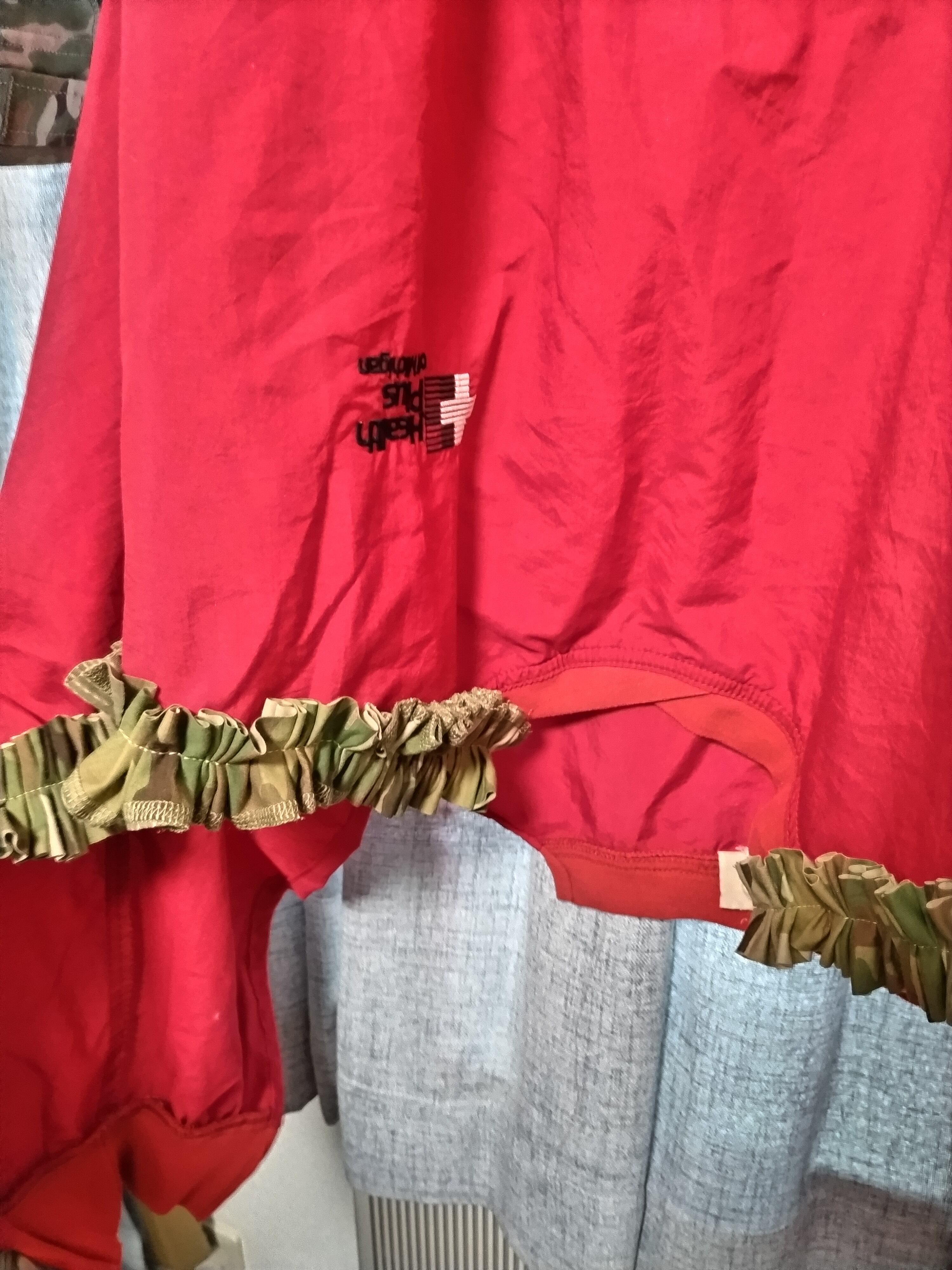 迷彩ジャケットとひっくり返したhealth plusの赤のビッグトレーナー(軽い生地)合体の変形ワンピース