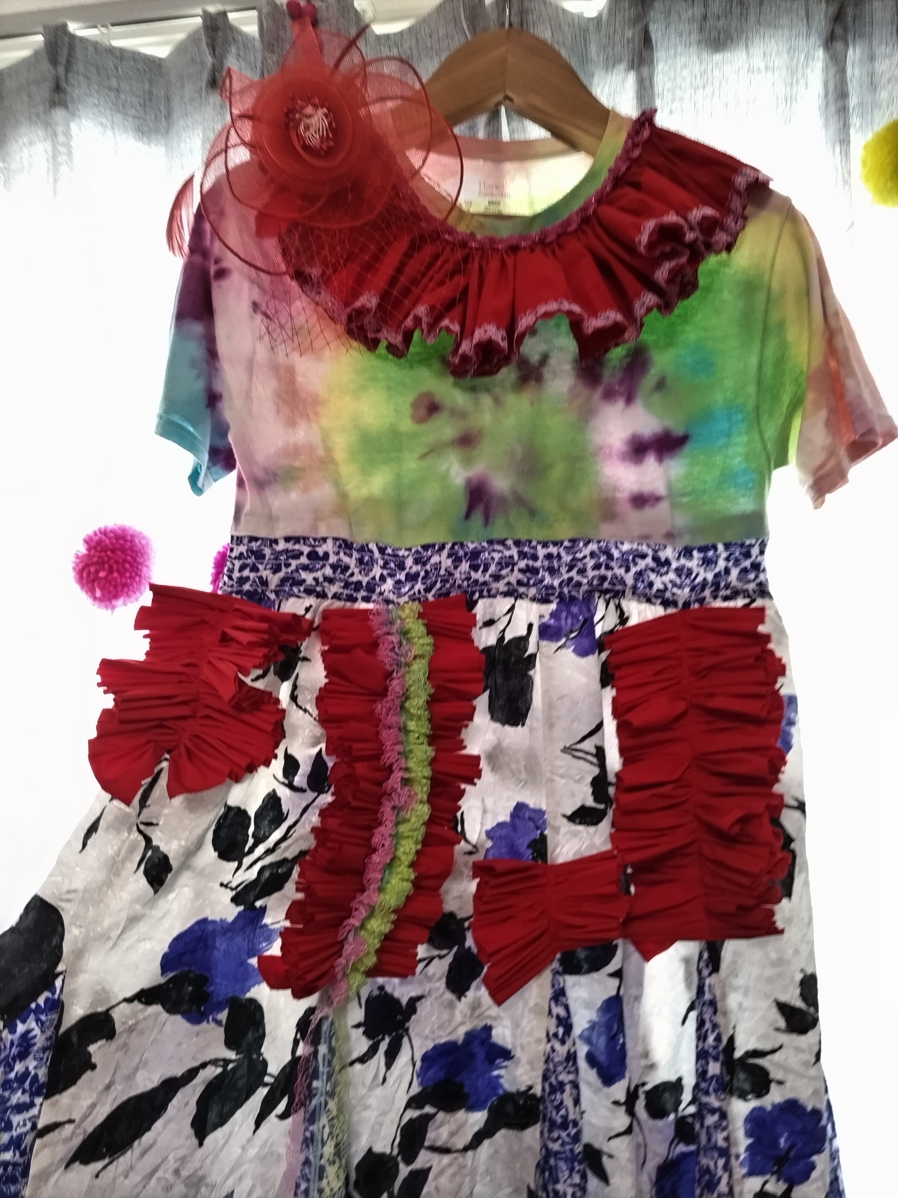 タイダイ+青の花柄フレアースカートに赤のフリフリ、コサージュつけましたよワンピース