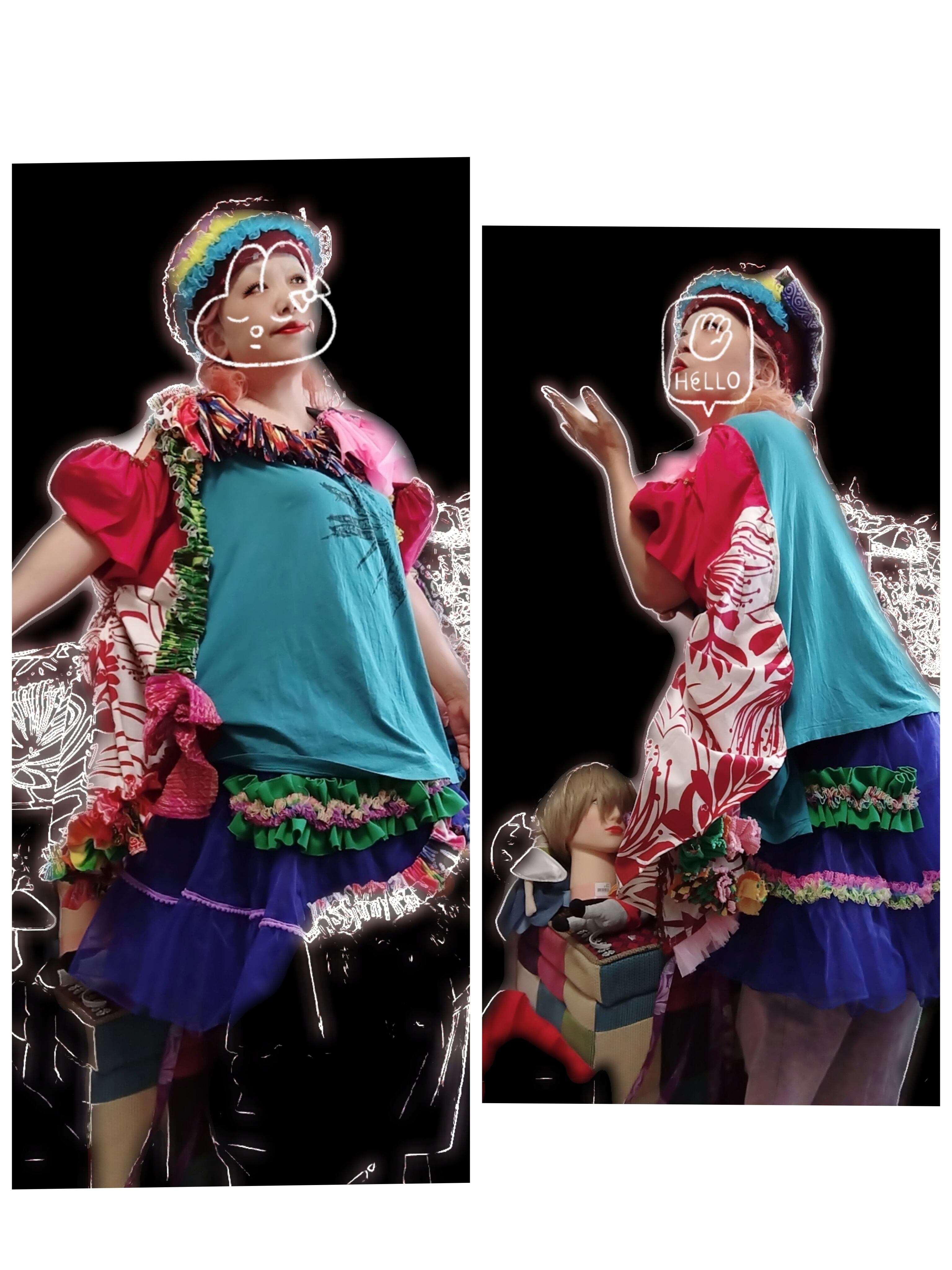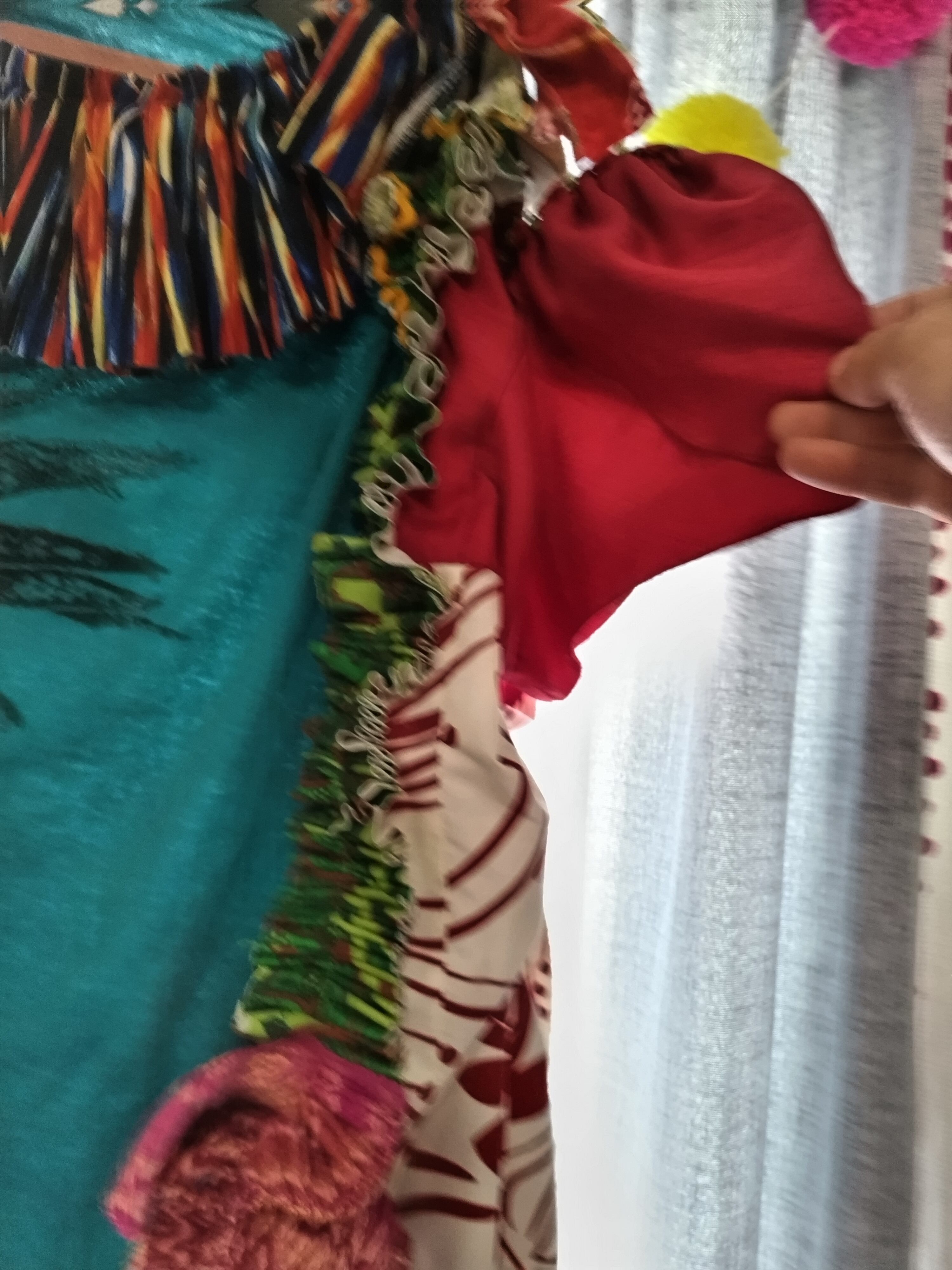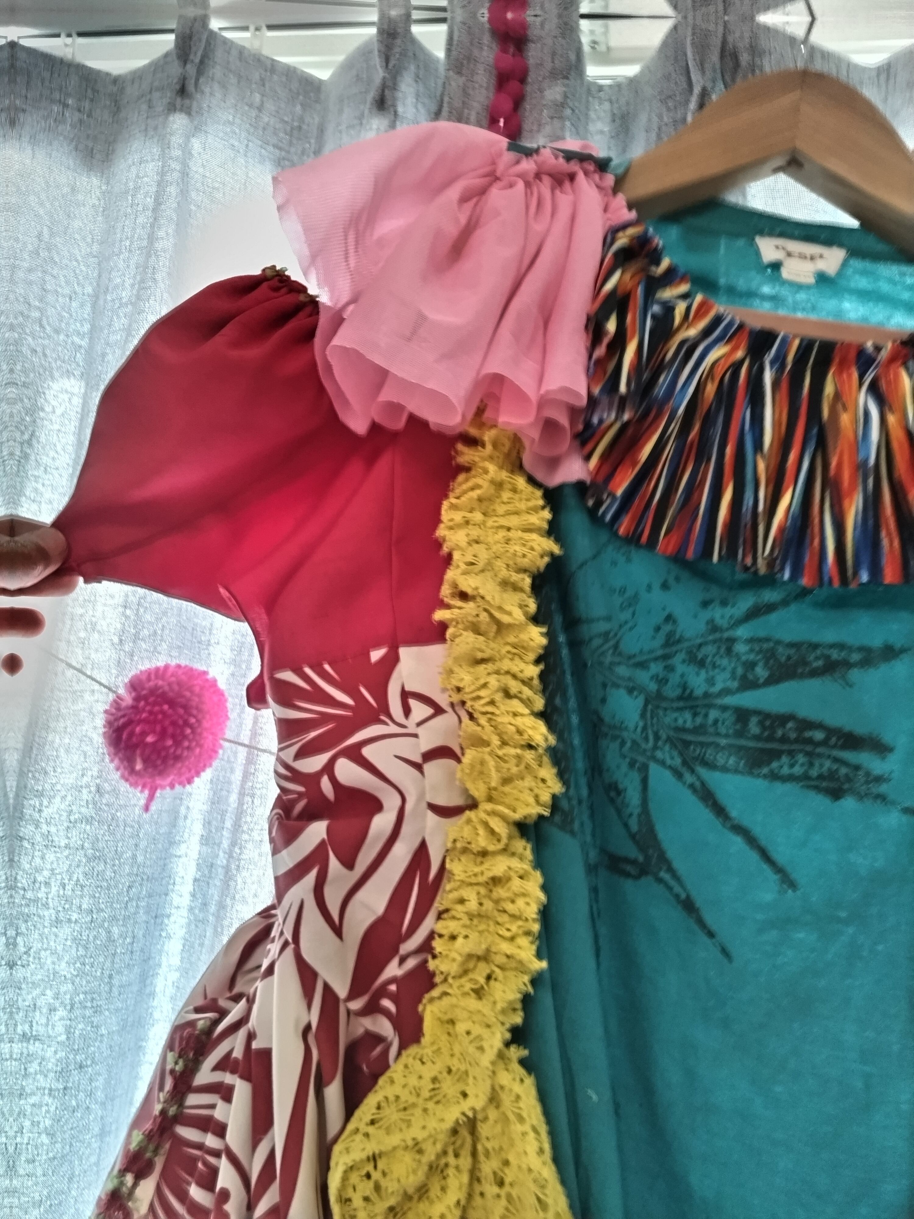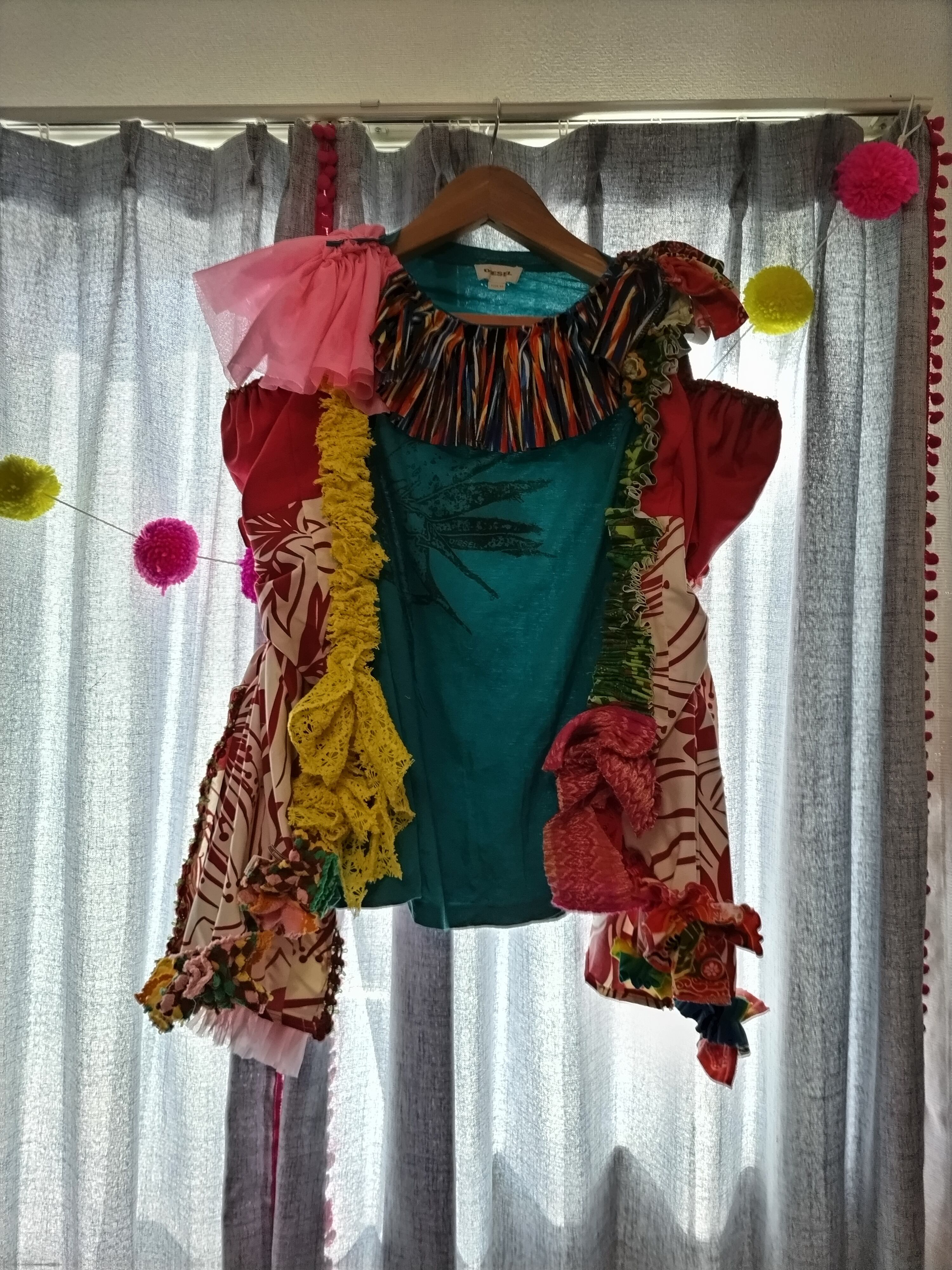 超カラフルまぜこぜワンピースやけど脇下いつものように絞ってるからトップスになっちゃう服。ちなみに中央の生地はDIESELです!知らんけどw