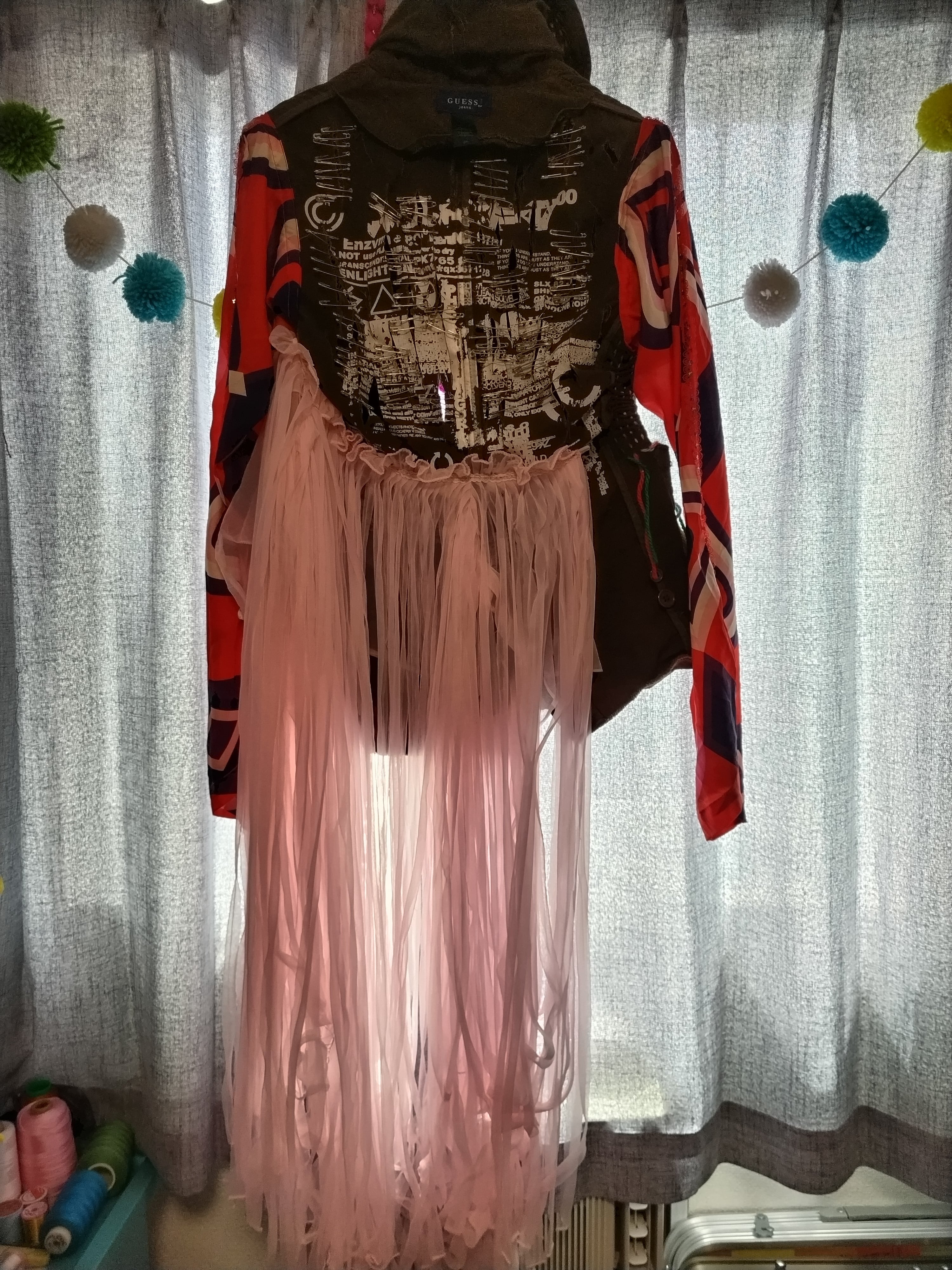 袖はサイケな色合いにして、元の袖は襟元に針金入れてデザイン自由に!ジャケットダメージ加工、シースルーの薄ピンクのネグリジェをアクセントに付けて縦にフリンジ風にカットしました!後はネオンカラーの毛糸をぬいぬいしてクシュクシュしましたわ