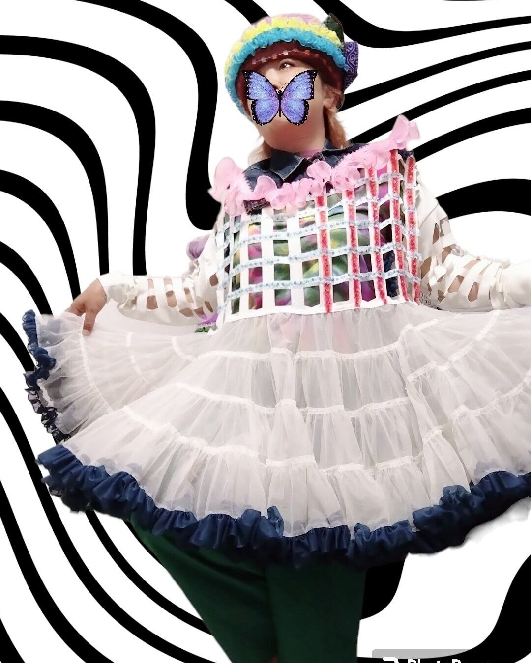 クロスの□穴あきトップスに最上級のパニエをドッキング+デニム付け襟です。首、手首はダメージカットしてます