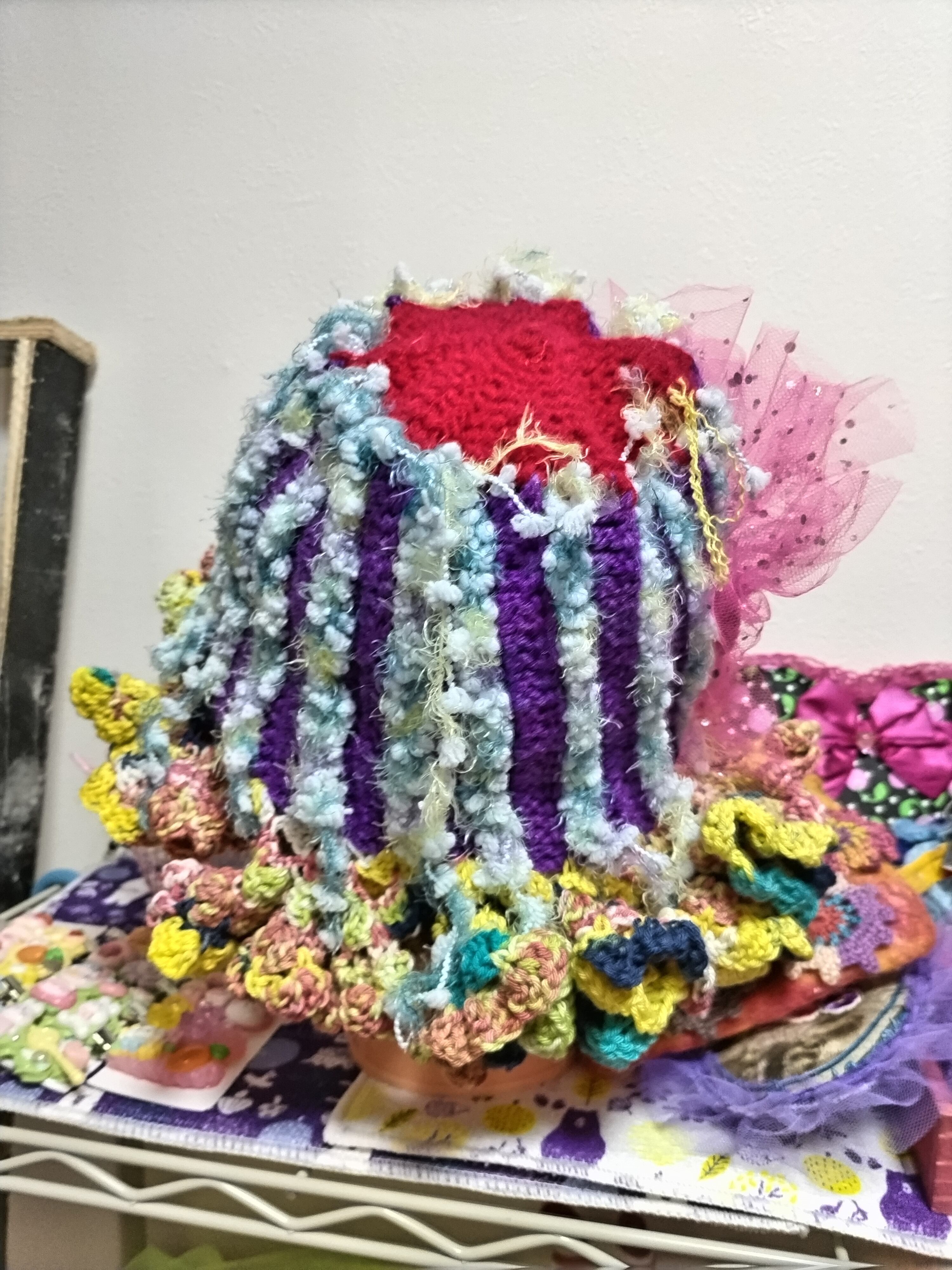 ちょーちょーカラフルなふりふり手編みニット帽子