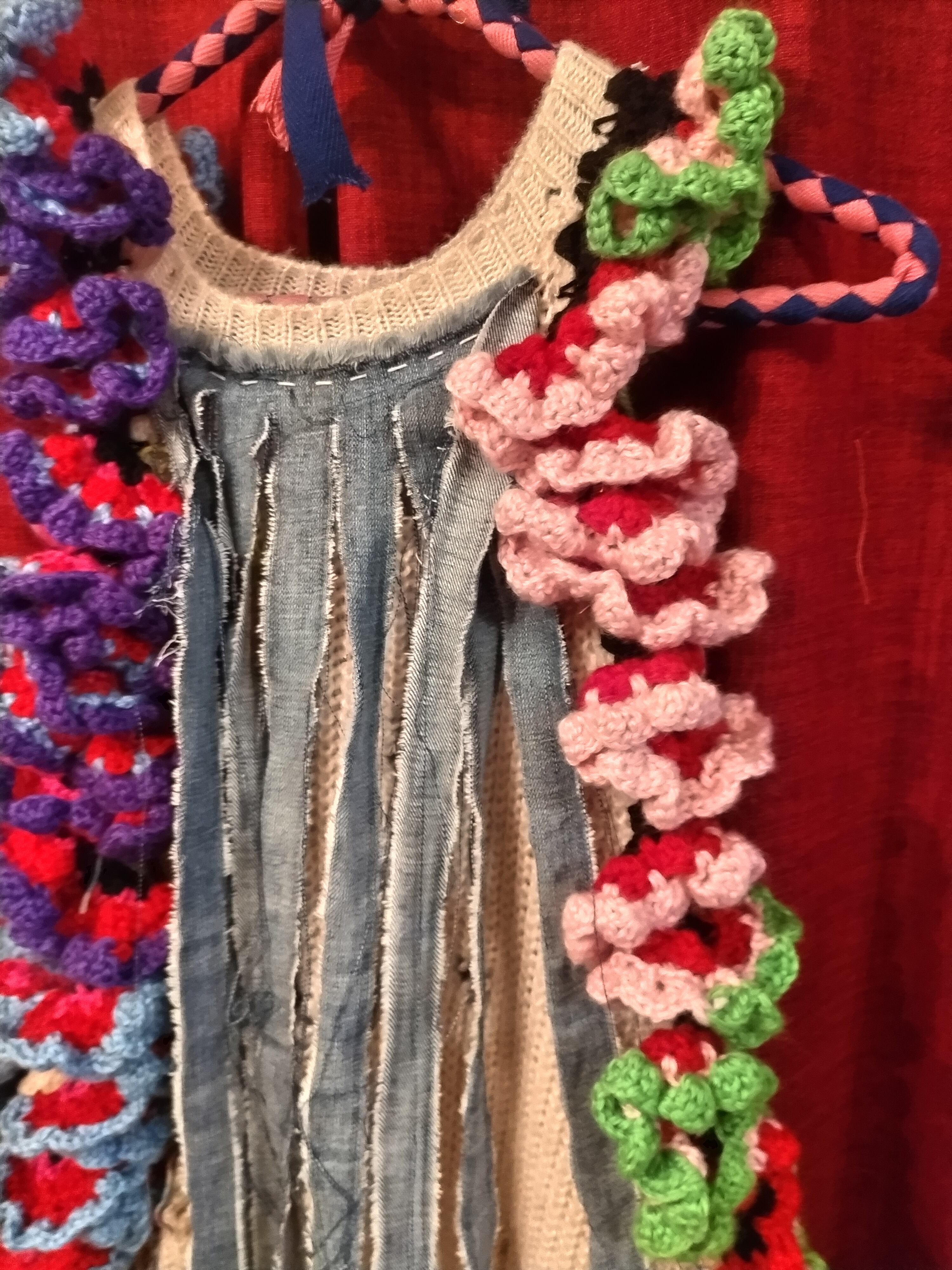 土台の毛糸はパステルピンクの脇部分に別毛糸のカラフルふりふりちゃん、スソに別生地付けて〜最後に前と横にデニムのフリンジ付けましたよ
