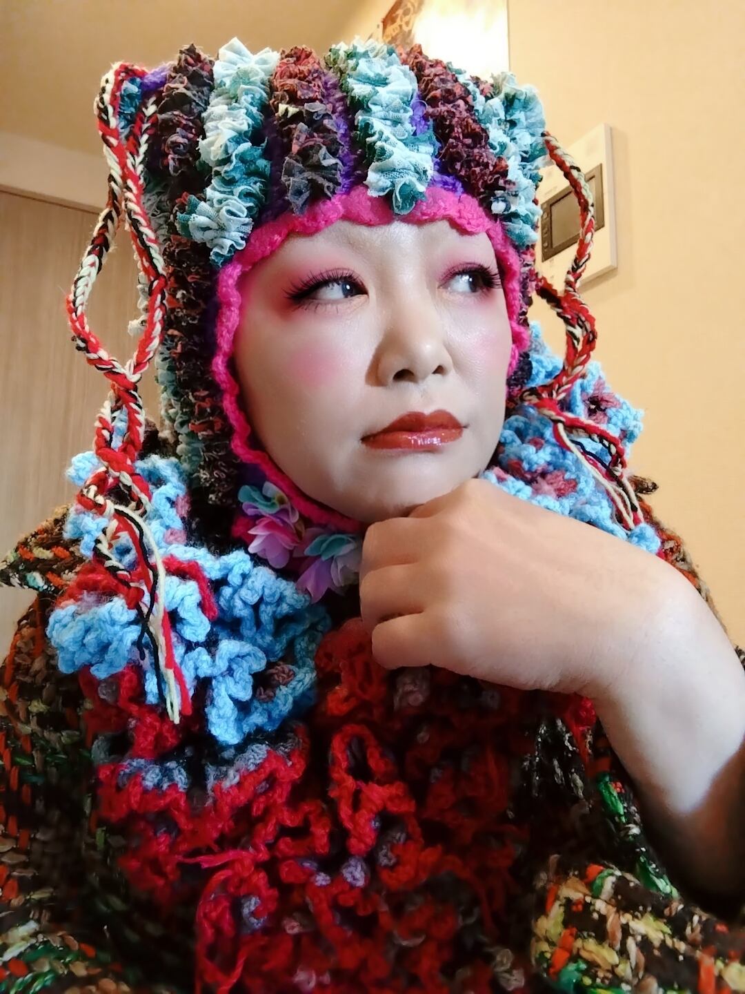 紫と赤の毛糸とニット生地のふりふり柄がかわいいあごにはお花のアクセント