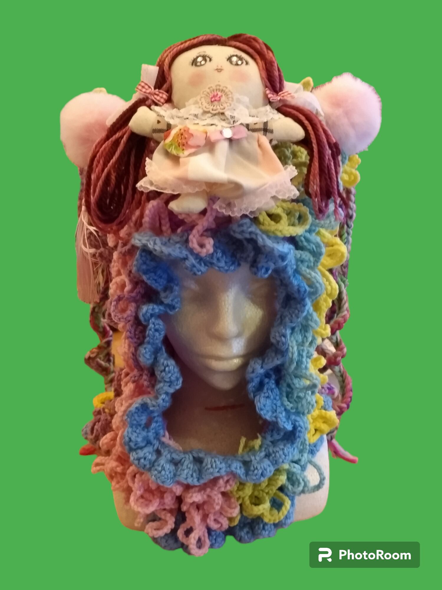 本体の紫毛糸に5色の別の毛糸をもじもじして、ぼんぼりとかわいい娘を付けてみた。そんじょそこらではない帽子やで!