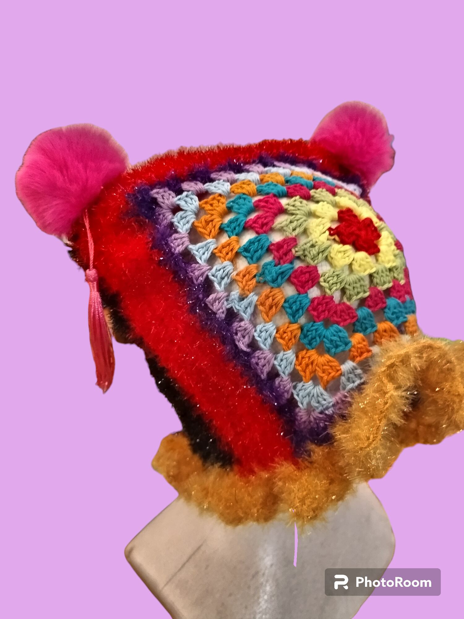 猫耳ピンクぼんぼりのグラニースクエアのニット帽子