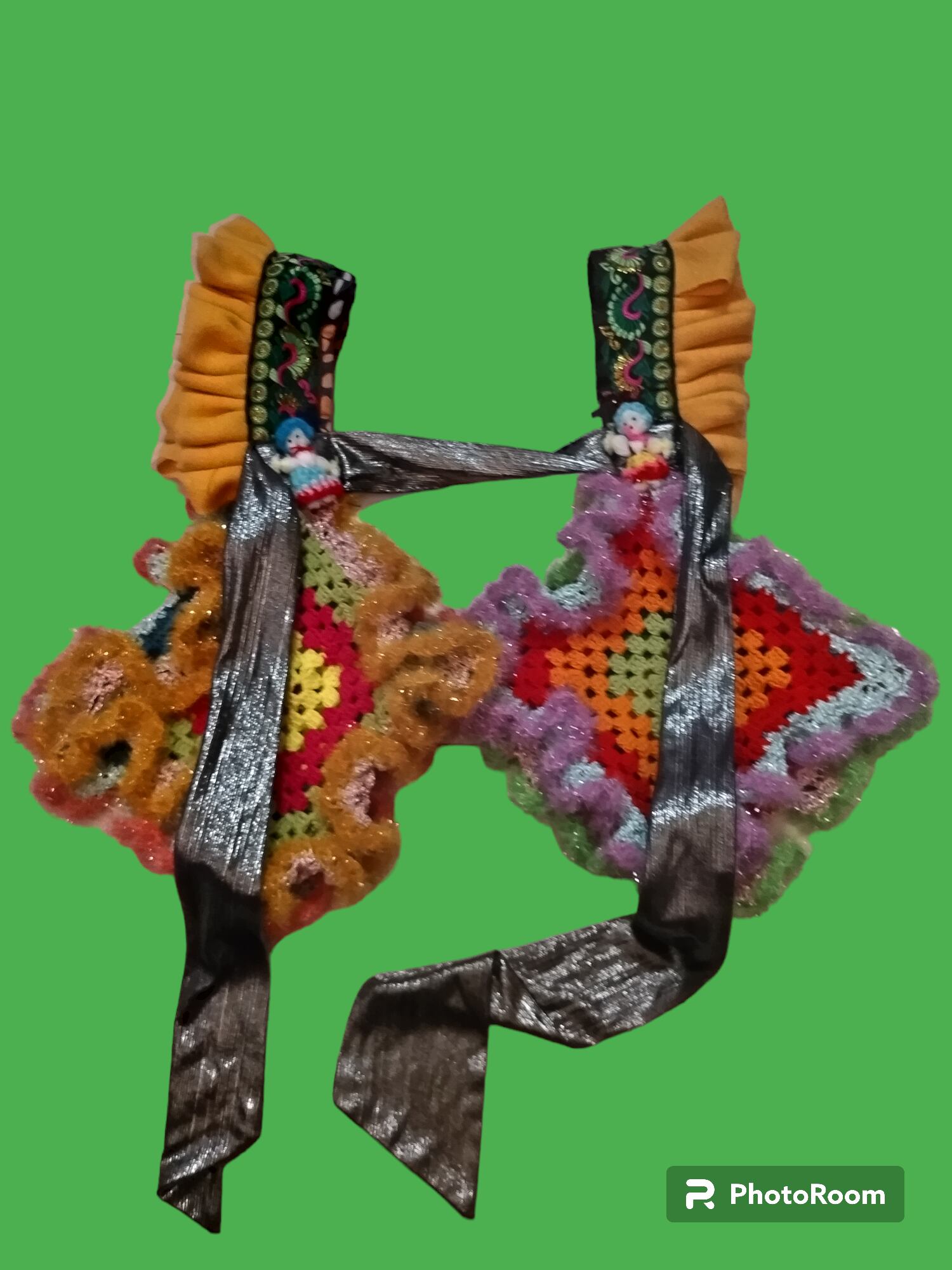 変な人形と刺繍リボンの肩がかわいいグラニースクエアキャミ
