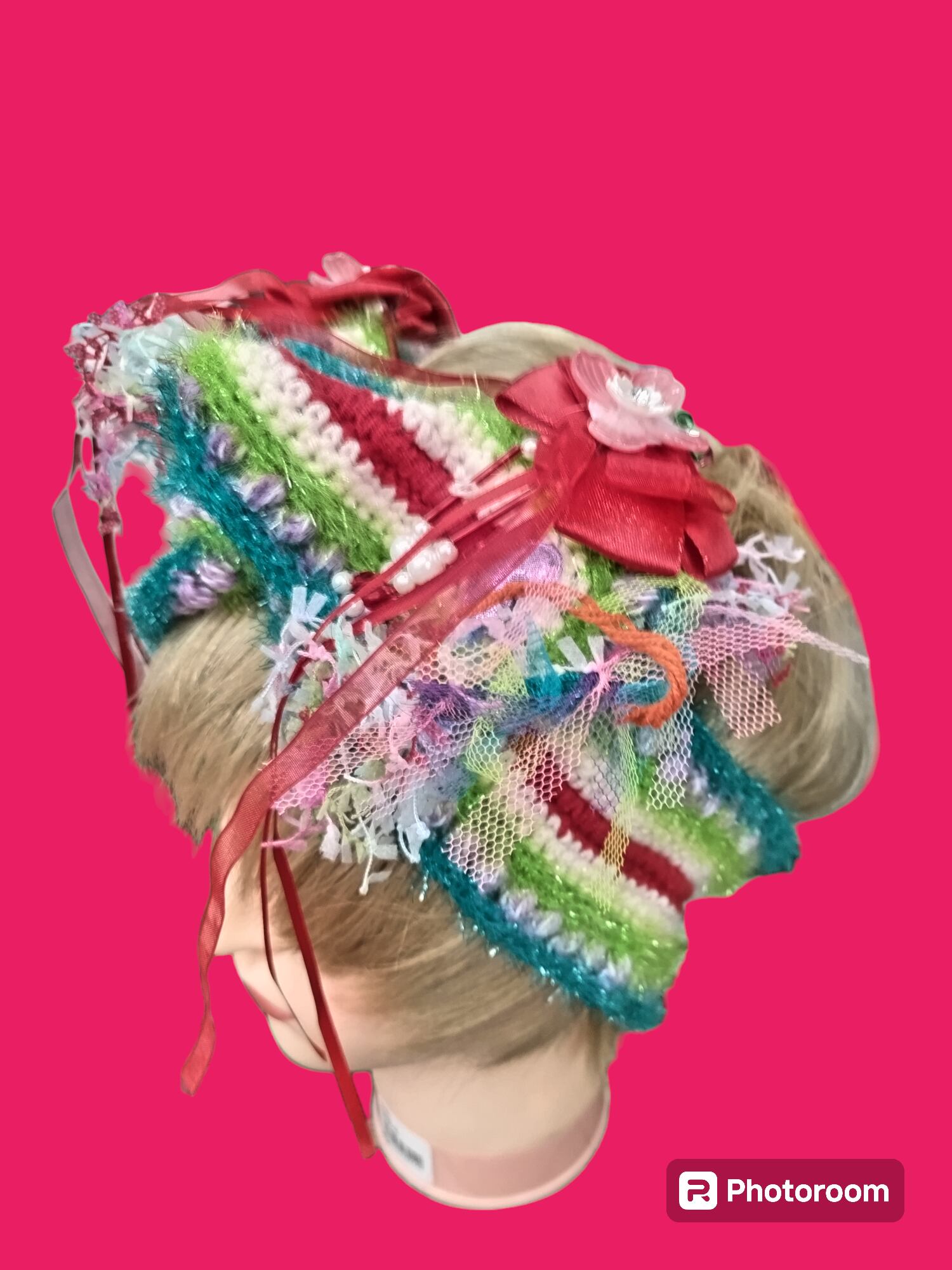 色は赤、薄い黄色、黄緑、緑の毛糸で裾に変わり糸、ハードチュール、赤いリボンで飾り付けています。