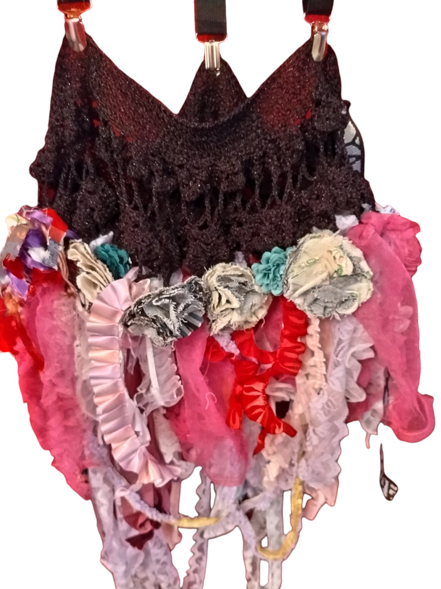 あとは、サスペンダーにもダメージ系の編んだフリル付けました。