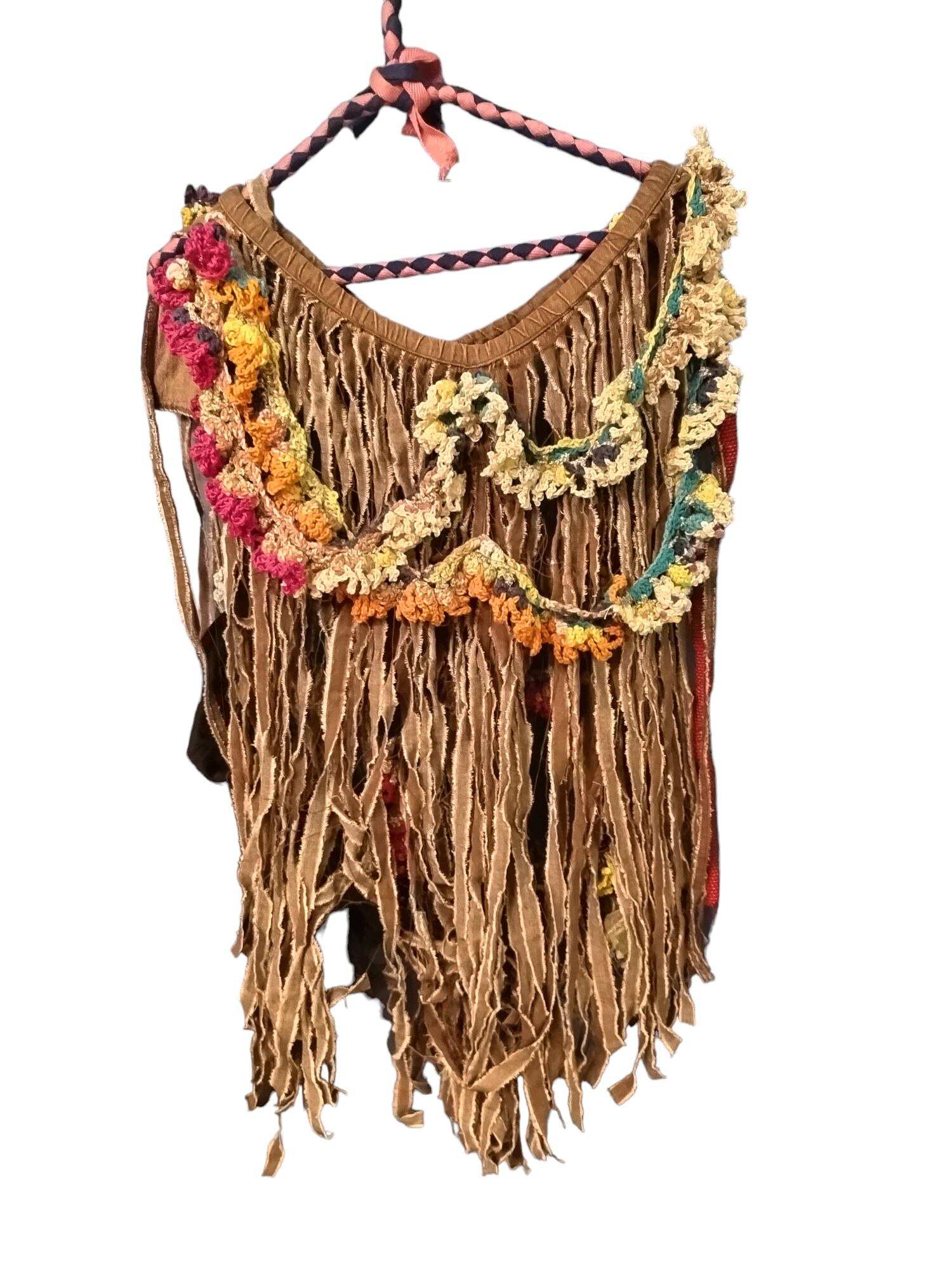 ヒザ下ぐらいのワイドパンツウエストひものものをクラッシュさせまして〜以前あみあみしたカラフル毛糸の長いのを飾って〜チョイト裾にアクセントで黒のチュールやらフリンジやらつけた歪なパンツ〜好きや