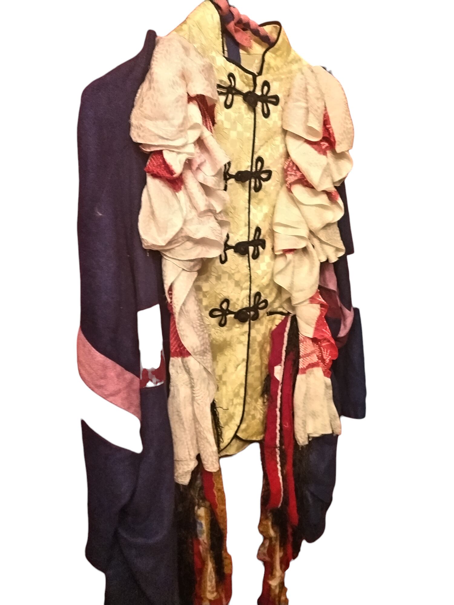 チャイナ風の黄色みのブラウスに紺の羽織をドッキング!ポイントに着物帯上げとヨーロピアンな赤の大判ショールクシュクシュビリビリしました。