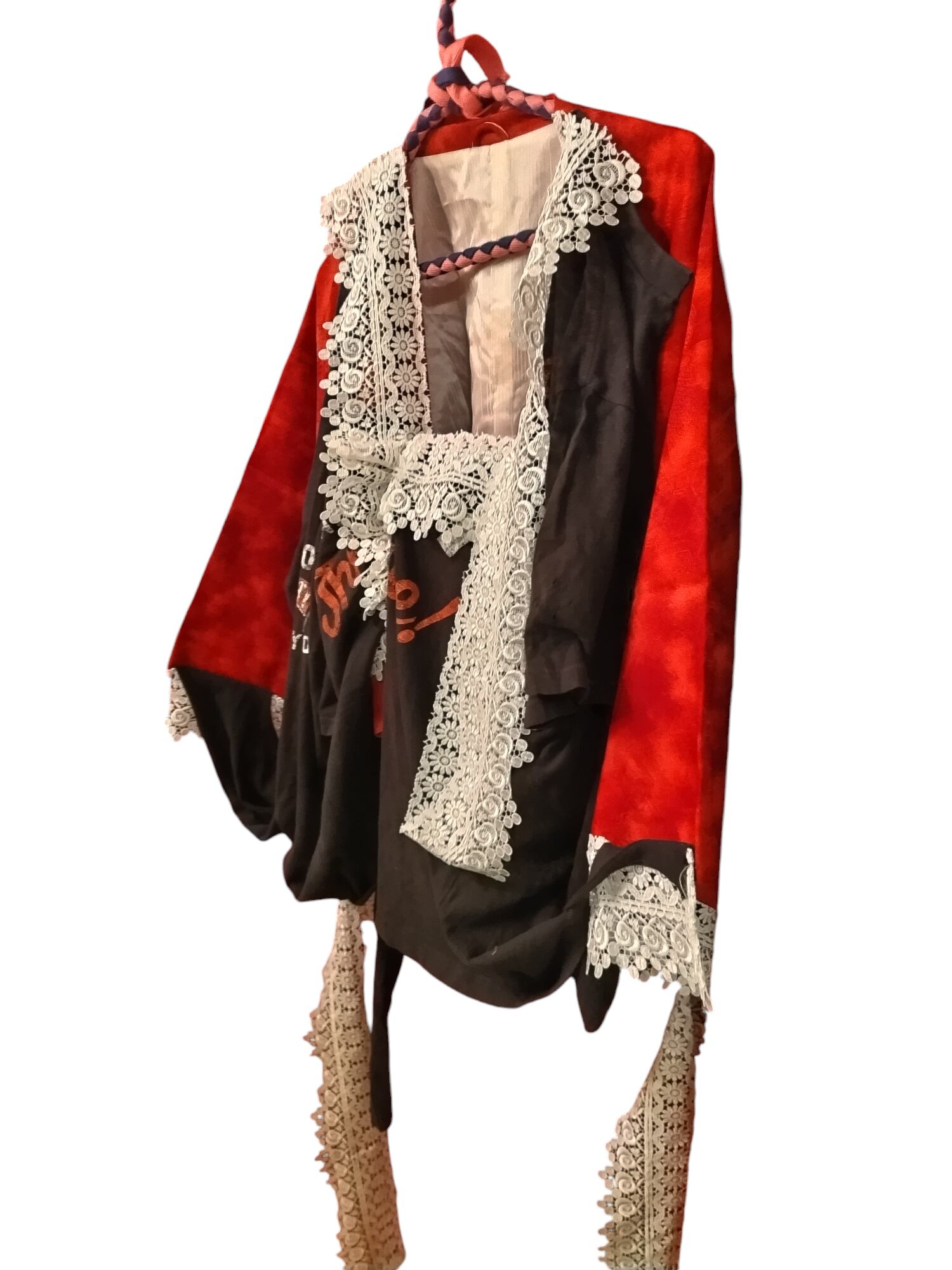 着物の道中着に白のレースと黒赤のTシャツ生地を無造作にドッキングして脇をクシュクシュ縫いして歪なシルエットにして見ました