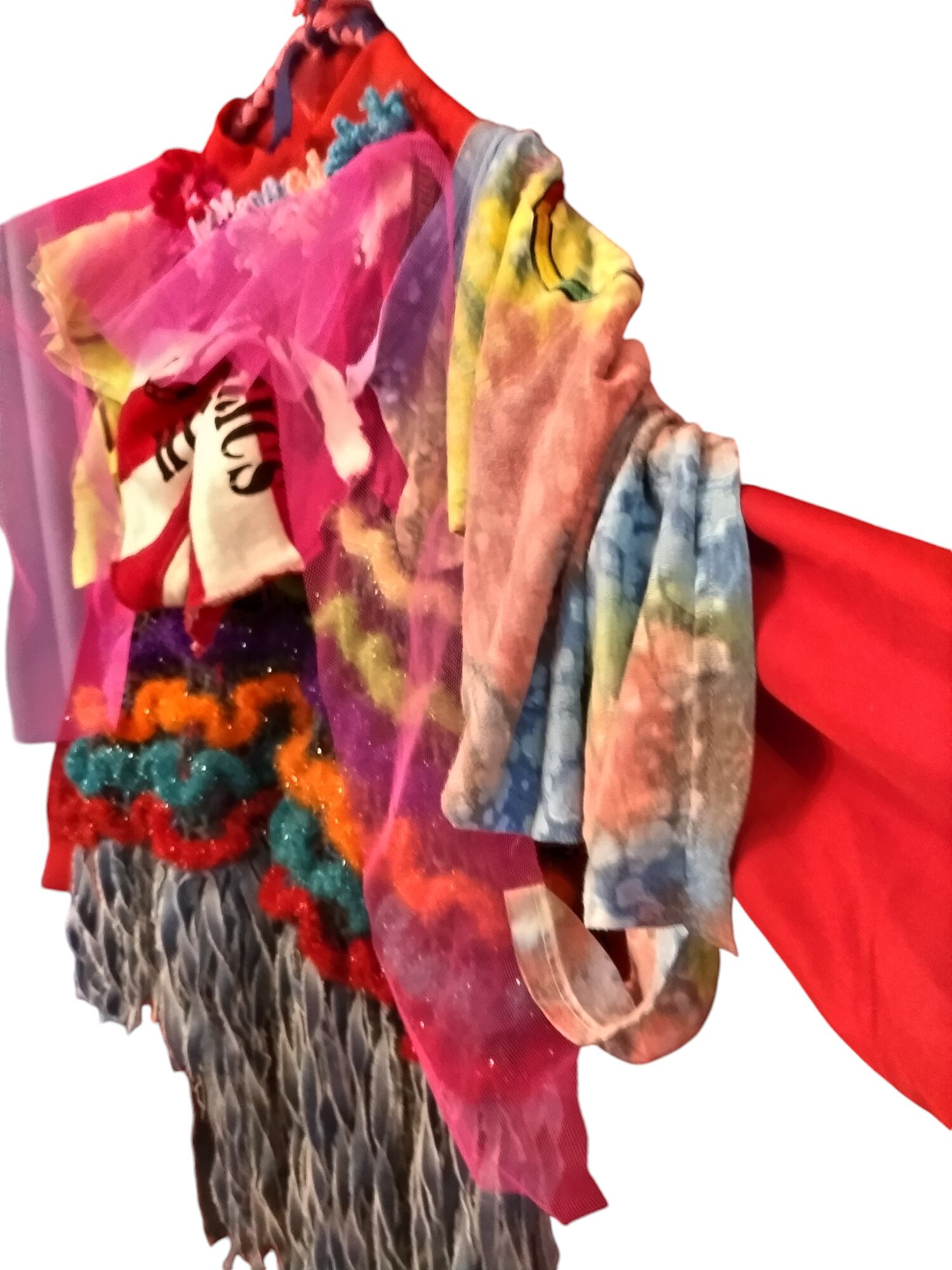 赤のシャカシャカロンTにビスチェを作ろうとしてた手編み毛糸にカラフルな布やチュールを付けました