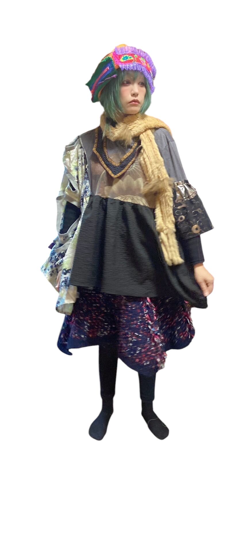 オリエンタル風のTシャツに片方にタイダイっぽいワンピースをドッキングして、所々に異なるアクセントの生地、ファーを付けました。