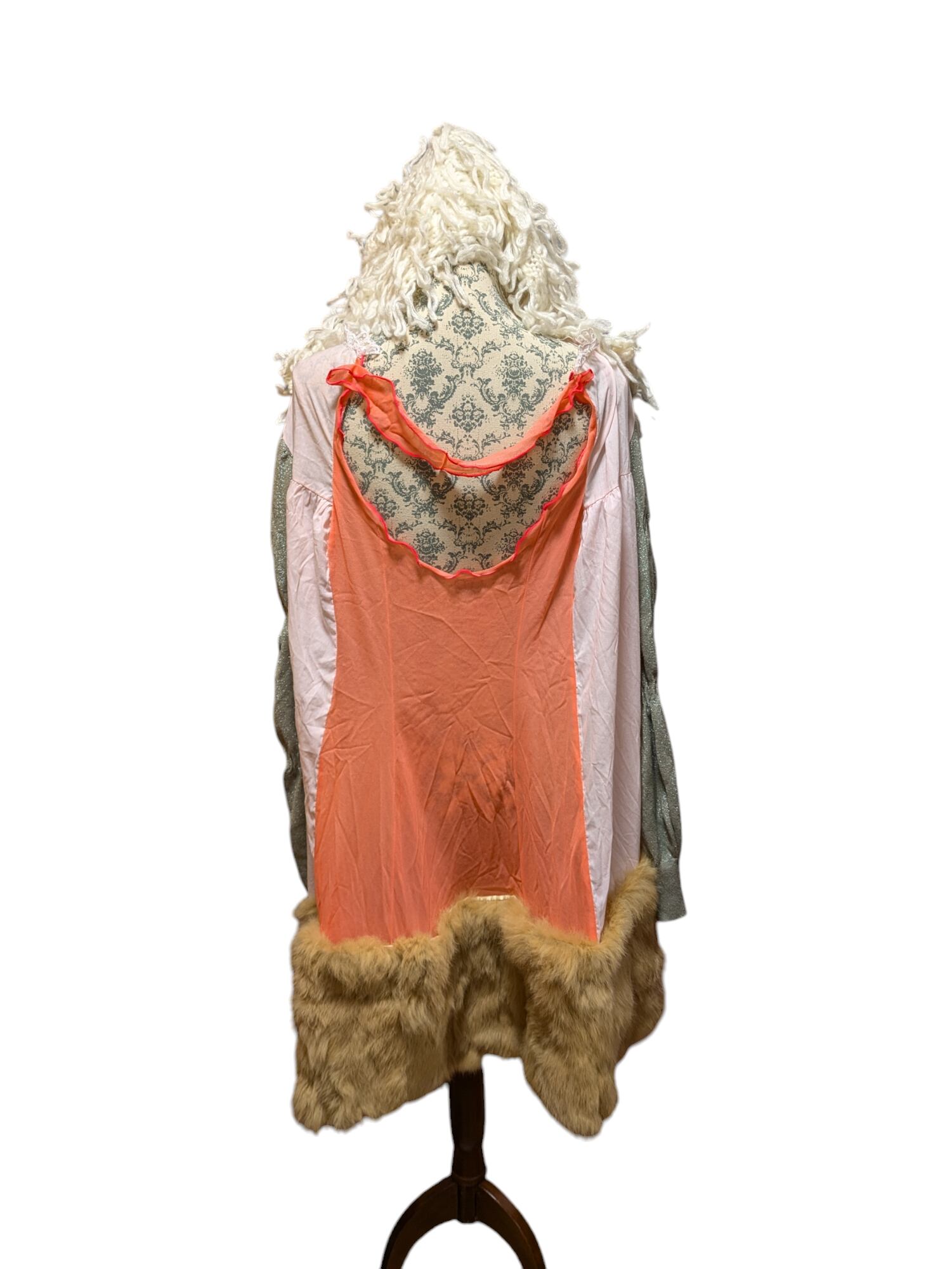 薄いピンクのネグリジェに異なる生地のファーやラメ生地をつけたりしたりしたワンピース。袖のギャザーがかわいい